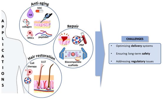 Applications and challenges of regenerative cosmetics. HA: Hyaluronic acid; LLLT: Low-level laser therapy; MSCs: mesenchymal stem/stromal cells; PRP: platelet-rich plasma; VitC: vitamin C. Source of some vectors: https://scidraw.io/ (accessed on 17 June 2024).