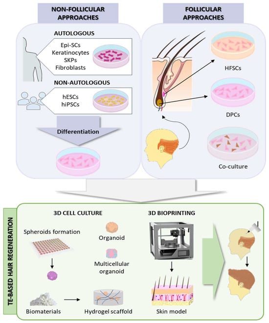 Non-follicular cell sources for HF regeneration include either autologous mesenchymal (adult dermal fibroblasts, skin-derived precursors [SKPs]) and epithelial (epidermal stem cells [Epi-SCs], adult epidermal keratinocytes) precursors obtained from outside the HF; or non-autologous reprogrammed pluripotent stem cells, such as human embryonic stem cells (hESCs) or human-induced pluripotent stem cells (hiPSCs) [66]. Conversely, follicular-based approaches are based on the combination of epithelial and mesenchymal cells from the HF. For that, DPCs and HFSCs need to be isolated from the patient and expanded in culture, but DPCs lose their innate trichogenic capacity in 2D in vitro culture [64]. To avoid this and better mimic the in vivo HF microenvironment, the current approaches are mainly focused on 3D cultures to preserve intercellular interactions. DPCs in spheroid and organoid cultures have been shown to preserve their characteristics even in high passages [64].