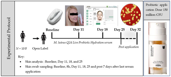 Ten females participated in a single-site, open-label, non-randomised, baseline-controlled trial. The study design is shown in Figure 1. The study included healthy adult females between 18 and 60 years old with generally healthy skin but experiencing concerns like mild-to-moderate breakouts, fine lines, wrinkles, uneven skin tone, dullness, or redness. Participants were specifically interested in improving their facial appearance. To ensure participant safety, those with open cuts, active infections, autoimmune disease history, or current use of antibiotics, topical steroids, or anti-inflammatory medications were excluded. Participants were asked to apply two pumps equating to >1 × 108 cfu/dose (at the date of manufacturing) of the serum product on the face twice daily (morning and night) for 25 days.