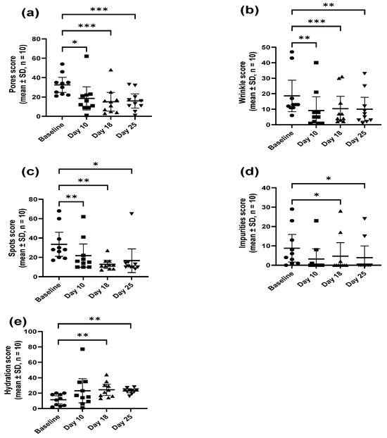Influence of M. luteus Q24 on the skin quality parameter scores of (a) pores, (b) wrinkles, (c) spots, (d) impurities, and (e) hydration following twice-daily application of live probiotic serum on the face of adult female participants. Statistical significance is indicated by the p-value, with lower p-values reflecting stronger evidence. p ≤ 0.05 (Statistically significant *), p ≤ 0.01 (Highly significant **) and p ≤ 0.001 (Very highly significant ***).