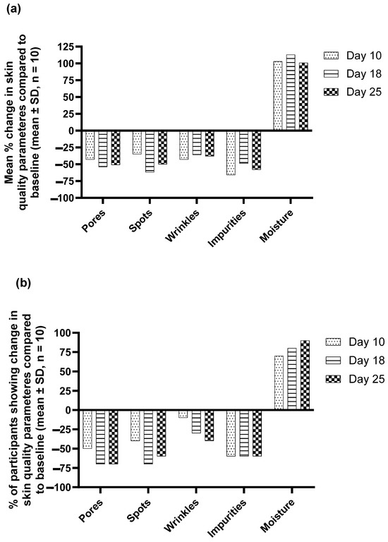 (a) Percentage change in score of skin quality parameters and (b) percentage of participants showing a change in skin quality parameters compared to baseline following twice-daily application of live probiotic serum on the face of adult female participants.