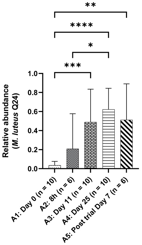 Mean relative abundance of M. luteus Q24 on the face of participants following twice-daily application of M. luteus Q24 serum. Data points are means ± SD (* p ≤ 0.05). Statistical significance is indicated by the p-value, with lower p-values reflecting stronger evidence. p ≤ 0.05 (Statistically significant *), p ≤ 0.01 (Highly significant **), p ≤ 0.001 (Very highly significant ***), p ≤ 0.0001 (Extremely significant ****).