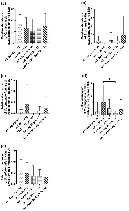 Mean relative abundance of skin pathogens (a) C. acnes, (b) S. aureus, (c) Corynebacterium, (d) P. aeruginosa and (e) S. epidermidis on the face of participants following twice-daily application of M. luteus Q24 serum. Data points are means ± SD (* p ≤ 0.05).