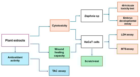 In our studies, for the evaluation of the cytotoxicity potential of plant extracts and their effects on cell viability, we applied two in vitro tests, respectively: an MTS assay (reduction in the tetrazolium salt), and LDH assay (the release of the cytosolic enzyme lactate dehydrogenase into the extracellular media). Also, the in vivo acute toxicity was investigated using two Daphnia species, Daphnia magna and Daphnia pulex, and the potential teratogenic effects were explored through an embryo test conducted on Daphnia magna embryos. In order to obtain information about the effectiveness of phytocomplexes in damaged skin tissue, the antioxidant potential of the bioactive constituents was evaluated (Total antioxidant capacity assay—TAC assay), as well as the efficacy of the extracts through an in vitro cell migration test (“scratch-test”), both tests being performed on standardized normal human keratinocyte cell lines. The studied extracts’ toxicity and cell migration-stimulating tests represent the starting point in developing topical products customized for the xerosis stages based on the characteristic symptoms.