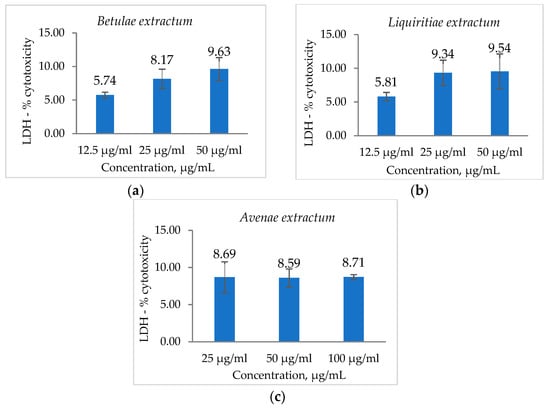 This current work evaluated the cytotoxicity, cellular antioxidant potential, and capacity of stimulating keratinocyte migration of three extracts (Betulae cortex extract—BE, Liquiritiae radix extract—LE, and Avenae herba extract—AE). The cytotoxicity was tested in vitro on human normal keratinocytes (HaCaT) cell lines and in vivo on Daphnia species. Cell toxicity testing in multiple models is considered necessary experimentally to observe possible differences in results obtained under distinct culture and test conditions. The principle of the cytotoxicity assay is based on lactate dehydrogenase (LDH), a cytosolic enzyme present in all cells, which remains in the cytoplasm under normal physiological conditions of the plasma membrane. In vitro LDH release provides a precise way to measure cell membrane integrity and, by implication, cell viability. Cell destruction is inevitable due to the loss of the cell’s ability to maintain and provide energy for the metabolic activity of cell function and growth [18]. The results highlight that BE and LE are more cytotoxic than AE. Also, there is a dose-dependent relationship, especially for BE, for which the highest cytotoxicity was obtained at 50 µg/mL and the lowest at 12.5 µg/mL. Almost similar results were obtained for LE, the lowest toxicity associated with the 12.5 µg/mL concentration. The results were almost identical for the other two concentrations, 25 and 50 µg/mL. For AE, there was no dose-dependent relationship for all three tested concentrations (25, 50, and 100 µg/mL), with very close values. However, the cytotoxic effect was significant compared to the control (p < 0.05) for all concentrations tested for BE, LE, and AE. Thus, the cytotoxicity was much less in the case of AE because it induced changes at a higher concentration than the other analyzed extracts (BE and LE), which were active at lower doses.
