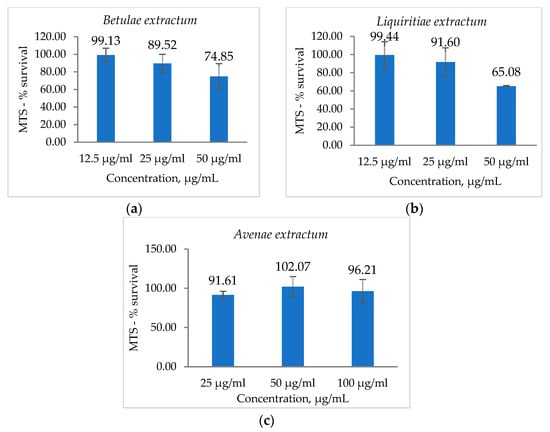 In order to perform the in vitro tests, the three dry extracts (Betulae extractum—BE, Liquiritiae extractum—LE, and Avenae extractum—AE) were obtained in two successive extraction stages with 50% ethanol, and were dried using lyophilization as described previously [21]. The three extracts were initially evaluated for their toxicity and teratogenic potential on Daphnia magna and Daphnia pulex. Subsequently, for the activity evaluation assays, we selected concentration ranges based on these preliminary toxicity tests and additional prescreening tests to ensure the measurable effects in the study’s specific assays. Thus, for Betulae extractum and Liquiritae extractum, concentrations ranging from 12.5 to 50 µg/mL were chosen, whereas for Avenae extractum, a slightly higher range of 25 to 100 µg/mL was chosen due to its distinct bioactive profile.