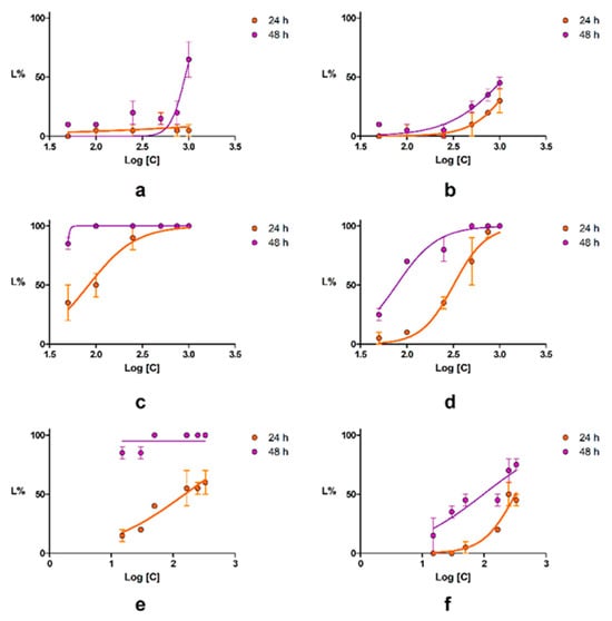 The lethality curves obtained after 48 h exposure of Daphnia magna (a,c,e) and Daphnia pulex (b,d,f) to the three extracts: Avenae extract—(a,b); Liquiritiae extract—(c,d); and Betulae extract—(e,f). Error bars represent the SE of two replicates.
