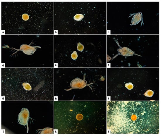 Daphnia magna embryo test: (a)—embryos at 0 h; (b)—intermediary larval stage untreated at 24 h; (c,d)—young daphnid untreated at 48 h; (e)—intermediary larval stage treated with 50 µg/mL LE extract at 24 h; (f)—young daphnid treated with 50 µg/mL LE extract at 48 h; (g)—intermediary larval stage treated with 15 µg/mL BE extract at 24 h; (h)—young daphnid treated with 15 µg/mL BE extract at 48 h; (i)—intermediary larval stage treated with 50 µg/mL AE extract at 24 h; (j)—young daphnid treated with 50 µg/mL AE extract at 48 h; and (k,l)—undeveloped embryos treated with 500 µg/mL AE extract at 24 and 48 h.