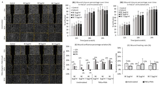 (A) Representative images from the in vitro wound healing test illustrating cell migration on the wound site (area marked with yellow) were acquired for 24 h using the 4× magnification objective in bright-field high-contrast mode (scale bar = 1000 µm). The wound healing process evaluation in the presence of BE using image-based cell analysis: the evolution of the wound confluence degree after 12 h and 18 h, respectively, and 24 h in cells treated without stimulation (B1), and pro-inflammatory stimulated with TNF-α 15 ng/mL and PMA 0.1 µM (B2). Calculation of the variation percentage for the wound confluence degree (C) and the wound healing rate (D) compared to the untreated cell control. All numerical values are represented as mean (n = 3) ± standard deviation (SD); (* p < 0.05; ** p < 0.01).