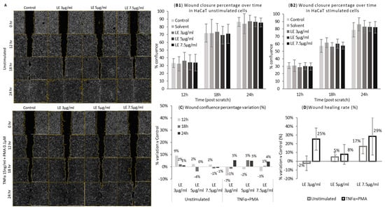 (A) Representative images from the in vitro wound healing test illustrating cell migration on the wound site (area marked with yellow) were acquired for 24 h using the 4x magnification objective in bright-field high-contrast mode (scale bar = 1000 µm). The wound healing process evaluation in the presence of LE, using image-based cell analysis: the evolution of the wound confluence degree after 12 h and 18 h, respectively, and 24 h in cells treated without stimulation (B1), and pro-inflammatory stimulated with TNF-α 15 ng/mL and PMA 0.1 µM (B2). Calculation of the variation percentage for the wound confluence degree (C) and the wound healing rate (D) compared to the untreated cell control. All numerical values are represented as mean (n = 3) ± standard deviation (SD); (p > 0.05).