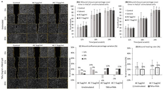 (A) Representative images from the in vitro wound healing test illustrating cell migration on the wound site (area marked with yellow). The images were acquired for 24 h using the 4x magnification objective in bright-field high-contrast mode (scale bar = 1000 µm). The wound healing process evaluation in the presence of AE using image-based cell analysis: the evolution of the wound confluence degree after 12 h, and 18 h, respectively, and 24 h in cells treated without stimulation (B1), and pro-inflammatory stimulated with TNF-α 15 ng/mL and PMA 0.1 µM (B2). Calculation of the variation percentage for the wound confluence degree (C) and the wound healing rate (D) compared to the untreated cell control. All numerical values are represented as mean (n = 3) ± standard deviation (SD); (p > 0.05; * p < 0.05).