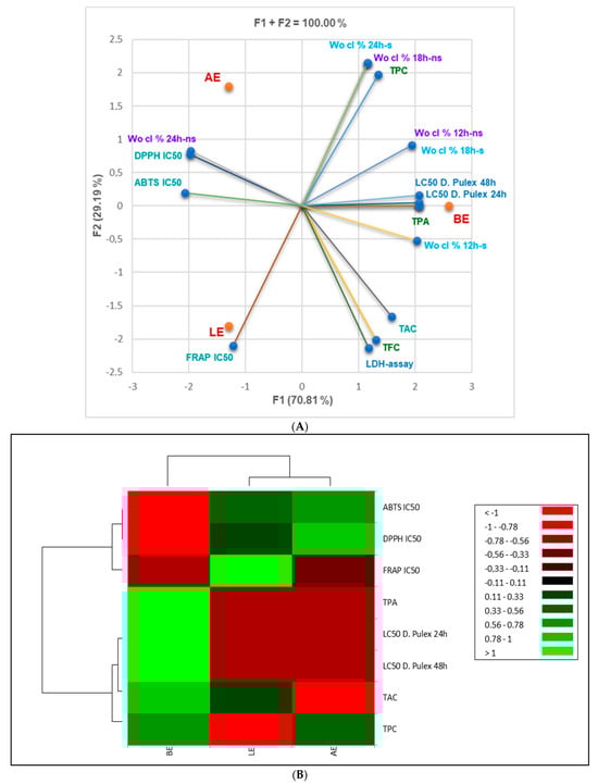 (A) Correlations between bioactive constituents and pharmacological potential of all three extracts. (B) Hierarchical clusters and heat map analysis. BE = Betulae cortex extract; LE = Liquiritiae radix extract; AE = Avenae herba extract; IC50 = median inhibitory concentration of free radical generation in DPPH, ABTS, and FRAP assays; LC50 = median lethal concentration on D. pulex; TAC = total antioxidant capacity; Wo cl % = wound closure percentage; 12, 18, 24 = measuring period; ns = unstimulated HaCaT cells; s = pro-inflammatory stimulated HaCaT cells; LDH assay = cytotoxic capacity evaluation assay. Where the results are expressed as percentages: TPA = Total phenolic acids, TPC = total polyphenols content, and TFC = total flavonoid content.