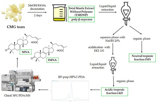 CMG is a particularly challenging substrate due to its resinous nature, which is largely due to its natural polymer cis-1,4-poly-β-myrcene [3]. Thus, most extraction efforts for the recovery of mastic’s compounds often begin with the removal of the insoluble polymer, usually by decantation with an appropriate solvent system. In our case the method proposed by Paraschos et al. was employed with slight modifications [15], whereby the polymer is removed after a two-day decantation with a mixture of MeOH and EtOAc. Subsequently, the TMEWP was further separated into the acidic (AF) and neutral terpene fractions (NF) via a series of liquid/liquid extractions with different polarities and pH conditions. Through this process, the acidic terpenes are first transformed to sodium salts with the addition of NaOH—thus staying in the aqueous/polar phase—while neutral terpenes are partitioned in the organic/non-polar phase. Next, the aqueous solution is re-acidified with HCl and extracted with a non-polar solvent system to obtain the non-ionized forms of the acidic terpenes.