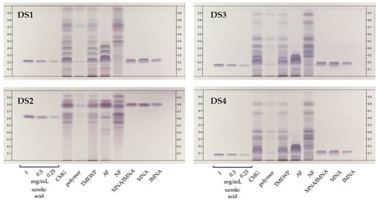 First, as a general remark, we observe that none of the proposed systems is able to fully distinguish the isomers MNA and IMNA, which in most cases elute as a single dark purple-blue broad band that appears to largely dominate the profiles of both the pure CMG and the TMEWP. Moreover, DS1 offers a significant advantage for the analysis of CMG’s acidic terpenes since it is able to separate several bands that cluster tightly together with the other systems. Among these, we note two light blue-gray bands (DS1, Rf 0.35 and 0.42 respectively) that, according to our previous studies, correspond to the pentacyclic triterpenes and isomers of MNA and IMNA, oleanonic and moronic acids [20]. Additionally, DS1 allows us to observe the successful and satisfactory separation of mastic’s AF and NF that seem to possess quite distinctive profiles.