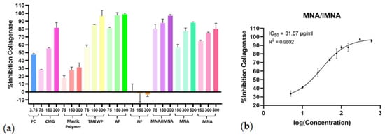 The initial screening results displayed significant collagenase inhibitory effects at concentrations of 75 μg/mL, 150 μg/mL and 300 μg/mL for CMG, TMEWP, AF and the MNA/IMNA mixture, and at 150 μM, 300 μM and 500 μM for the pure compounds. In contrast, the polymer and NF exhibited minimal to no inhibitory effects (Figure 3a). For the CMG products with the most potent activity, further experiments were carried out to calculate dose−response curves (R2 > 0.97) and the half-maximal inhibitory concentration (IC50). The AF exhibited strong anti-collagenase activity (IC50 = 38.52 μg/mL), while the mixture of pure compounds MNA/IMNA was the most potent with an IC50 value of 31.07 μg/mL (Figure 3b); interestingly, the TMEWP extract demonstrated enhanced activity compared to the crude CMG resin. Finally, it is worth mentioning that the MNA/IMNA mixture was more effective than the isolated pure compounds, indicating a possible synergistic effect. What is more, when comparing the two isomers, IMNA showed stronger anti-collagenase activity; a fact which could be attributed to the position of the double bond on the B-ring of the triterpenic scaffold, which greatly influences the compounds’ stereochemistry and therefore their capacity to bond to active sites of enzymes.