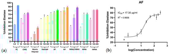 (a) Elastase inhibitory activity of CMG, CMG fractions, MNA/IMNA mixture and isolated pure compounds. Bars represent mean ± S.D., n = 3. (b) Dose−response curve of the most potent anti-elastase sample (AF). PC = positive control.
