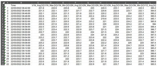The wattmeter installed conducted monitoring with a frequency of 120 s. For each time interval, a comprehensive set of output parameters was recorded. The structure of the datasets obtained is illustrated in Figure 2, where the time intervals are represented as rows and the parameters as columns.