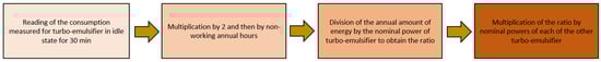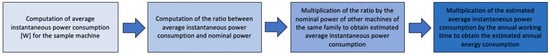 According to company guidelines, two working shifts of eight hours each per day were considered. Monitoring of the turbo-emulsifier, component assembly machine, and filling machine served as representative samples for their respective machine families. Indeed, the primary variation between machines within the same family was their size. The average power value for each monitored machine was determined by dividing it by the nominal power, thereby obtaining the ratio between the real average power and the nominal power. It was hypothesized that this ratio would be consistent across all machines within the same family. With the nominal power data available, it was then possible to estimate the average power of other machines and, subsequently, their annual energy consumption. The procedure is depicted in Figure 3.