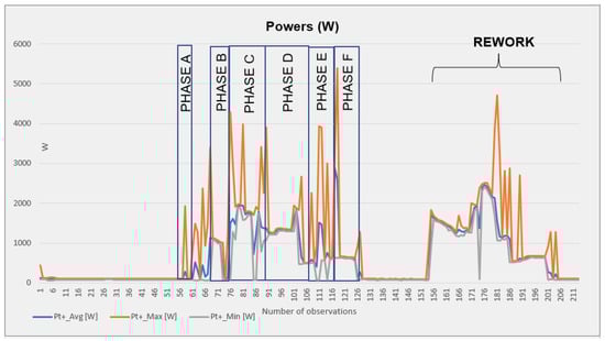 The highest power consumption occurs during periods when machine components (i.e., turbine, blades and counter-blades, pump) are active, as illustrated in Figure 12 and Figure 13. Specifically, the most significant peaks in power consumption are attributed to the turbine operating at medium-high speeds (speed settings of 7–8 in the first instance and 5 in the second, according to the speed settings of the turbo-emulsifier). A separate analysis was conducted to examine energy consumption during the work phase and the rework phase, with a focus on the contributions of different machine components. It was observed that the work phase requires higher power consumption compared to the rework phase. In both phases, the average power consumption mirrors the behavior of the minimum power levels, which occur when the machine is idle, and additional materials are added. Conversely, maximum active power consumption shows peaks during the initial work phase when the pump is activated or when the turbine operates at high speed (setting 8) and during the rework phase, primarily when the pump is on. Therefore, it can be concluded that the pump is one of the components that most significantly influences the maximum active power.