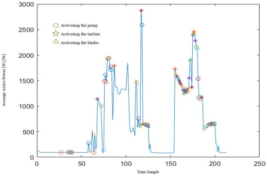 Chart of power consumption levels through the working cycle, with the marked activation of machine components. The time samples are chronologically ordered, and one-time sample corresponds to a two-minute interval, i.e., the measurement frequency.