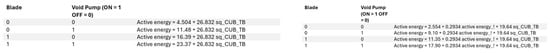 Overall, the initial work phase requires the same amount of active energy as the rework phase but remains more efficient in comparison. The rework phase is less efficient due to higher energy losses. When the machine is idle, it consumes less energy and achieves an efficiency of 96.24%. An analysis of the energy consumption across different machine states (defined by the activation of various components and their combinations) reveals the following: (a) the least efficient state is when the blades are active, with an efficiency of 61.17%; (b) the turbine, in conjunction with the blades, is associated with the highest apparent energy consumption, energy losses, and active energy requirements. In the rework phase, all states exhibit inefficiency, with the state where the blades are active being the least efficient. However, the state with the highest energy loss and active energy consumption is when both the blades and the turbine are active. The majority of active energy consumption can be attributed to the turbine, whether it operates alone or with other components. This is because the pump is typically active only for brief periods, and the blades are generally set to minimum speed. Approximately 80% of the average energy consumed per time interval is attributed to states in which the turbine is active. The variation in the average active energy contribution between the work and rework phases is due to changes in turbine speed, which should be closely monitored.
