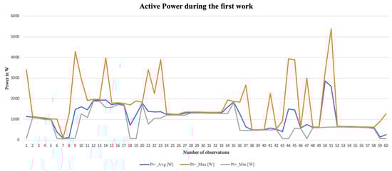 - This was the key parameter used to model the machine’s behavior on a minute-by-minute basis. Active power was selected because it is easily interpretable and represents the actual power consumed by the machine. The focus was on the average active power rather than the minimum and maximum values. This decision was made due to the long interval between consecutive data points (i.e., 2 min). Concentrating on singular minimum and maximum values for each 2-minute interval could lead to an underestimation or overestimation of the power behavior.