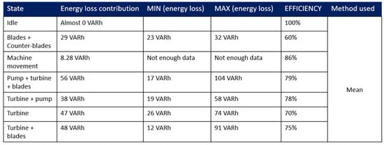 Moreover, energy losses vary with seasonal changes, and relying on a single dataset makes it challenging to conduct a precise analysis. Therefore, multiple measurements throughout the year are necessary to accurately assess the relationship between reactive energy and temperature. Consequently, an approximate value for energy loss per state was calculated by averaging the available data. The limited number of data points prevented the consideration of different ranges based on turbine speed. Nevertheless, the authors aimed to provide managers with an estimation of the energy loss magnitude. A summary of the contributions to energy losses is presented in Figure 14.