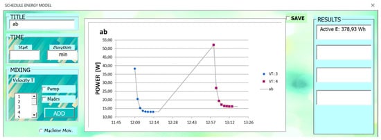 On the right side of the user form, several textboxes provide KPIs and useful information suggested to be monitored: (a) total active energy consumption in Wh; (b) approximated cost; (c) approximated CO2 emitted. The program also provides two checkboxes (info and delete) on each cosmetics recipe of the excel sheet. These facilitate the look for information about the recipe, allow for modification of existing operations, or permit their deletion.