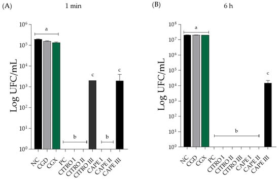 Mean ± SD of C. albicans biofilm count in Log (CFU/mL) of isolated compounds, in (A) treatment for 1 min and in (B) treatment for 6 h. Groups were treated with negative control (NC; 0.9% physiological saline solution), CAPE control (CGD—xanthan gum and DMSO), xanthan gum control (CGX), positive control (PC; 0.12% Chlorhexidine), CAPE I + CITRO I (5 mg/mL Citronella + 0.31 mg/mL CAPE), CAPE II + CITRO II (2.5 mg/mL Citronella + 0.15 mg/mL CAPE), CAPE III + CITRO III (1.25 mg/mL Citronella + 0.0775 mg/mL CAPE) and CAPE IV + CITRO IV (0.625 mg/mL Citronella + 0.038 mg/mL CAPE). The letters presented after each value indicate whether there were significant differences between the different concentrations (p < 0.05). Same letter—no significant difference. Different letter—significant difference. Results are expressed as mean ± SD. One-way ANOVA followed by Tukey’s post hoc test was performed.