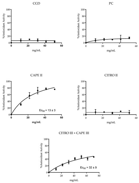 The antioxidant potential of the compounds and combinations was assessed by their ability to reduce the stable free radical DPPH. The results presented in Figure 4 indicate that CAPE, whether isolated or combined with citronella, showed antioxidant activity. The EC50 value for the CAPE/citronella combination was 32 ± 9 mg/mL (only the CAPE III + CITRO III group presented an antioxidant effect). The lowest EC50 (13 ± 3 mg/mL) for isolated CAPE indicated its higher antioxidant efficiency. In contrast, the other products evaluated showed no detectable antioxidant activity.