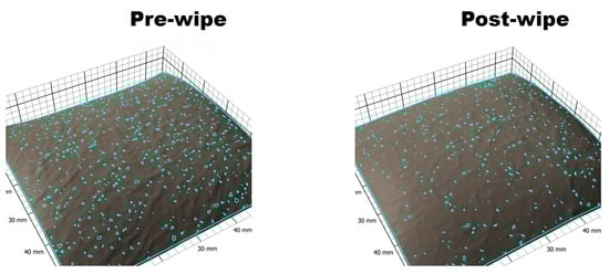 Hence, this study seeks to design and evaluate a new non-gravimetric method with potential future use for assessing the cleaning efficiency of new and existing commercial wipe products. The designed method involves the use of an Antera 3DTM camera known for its real-time dermal imaging, with advantages such as the delivery of accurate, quick, and objective data in different areas of skin studies and cosmetic product evaluation [9,10,11,12]. The Antera 3DTM camera (Miravex Ltd., Dublin, Ireland), under European Patent No. 2400890, operates on the principle of skin illumination from multiple angles, with skin surface data reproduced in a 3D manner using computer-enabled software to interpret the reflected light from the skin surface. Relevant skin data that can be generated with this instrument include skin pore counts, wrinkles, roughness, and pigmentation analysis [13]. Skin pores play a role in the release of sebum, sweat, and cell debris from the skin. Treatment of enlarged facial pores (with therapies such as ultrasound, broadband light, radiofrequency, and fractional non-ablative lasers) has been reported to be a leading cosmetic demand [14].