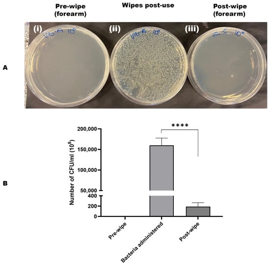 (A) A representative image showing the bacterial removal efficiency of test wipes from contaminated human skin. (i) Swab pre-wiping plated (ii) Used wipe plated (iii) Swab post-wiping plated. V = volunteer, A = Pre-wipe sample, B = Wipe post-use, C = Post-wipe sample, 100 = neat/undiluted sample. (B) Graph of bacterial removal efficiency of wipe product using E. coli and microbiological counting. Test wipes were observed to have 99.99% bacteria removal of what was administered. Paired t-test analysis of bacteria administered, and post-wipe count showed a highly significant difference (**** p < 0.0001). Graph was plotted as mean with SD (standard deviation) using GraphPad Prism 10. V = volunteer, A = Pre-wipe sample, B = Wipe post-use, C = Post-wipe sample, 100 = neat/undiluted sample.