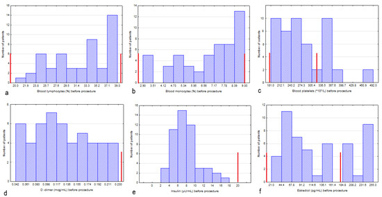 The results of the laboratory examination for each patient (n = 50) before the procedure: (a) blood lymphocytes (%), (b) blood monocytes (%), (c) blood platelets (×109/L), (d) d-dimer (mcg/mL), (e) insulin (μU/mL), (f) estradiol (pg/mL). The normal range is marked with red lines.