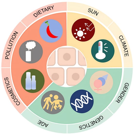 - Misery, L.; Morisset, S.; Seite, S.; Brenaut, E.; Ficheux, A.S.; Fluhr, J.W.; Delvigne, V.; Taieb, C. Relationship between sensitive skin and sleep disorders, fatigue, dust, sweating, food, tobacco consumption or female hormonal changes: Results from a worldwide survey of 10,743 individuals. J. Eur. Acad. Dermatol. Venereol. 2021, 35, 1371–1376. [Google Scholar] [CrossRef]