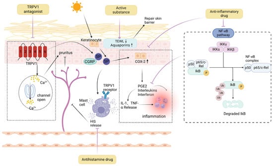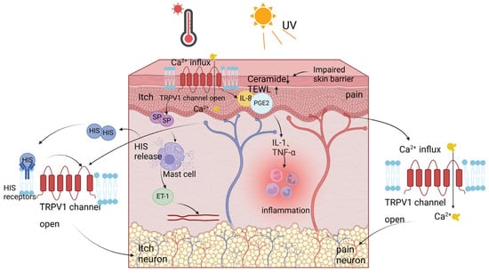 - Kang, S.M.; Han, S.; Oh, J.H.; Lee, Y.M.; Park, C.H.; Shin, C.Y.; Lee, D.H.; Chung, J.H. A synthetic peptide blocking TRPV1 activation inhibits UV-induced skin responses. J. Dermatol. Sci. 2017, 88, 126–133. [Google Scholar] [CrossRef][Green Version]