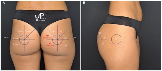 (A) on the right, pre-procedure marking of the buttocks showing the six gluteal areas (B1–B6) where injections should be applied. IB1 and IB2 are the danger zones. On the left, the suggested filler quantities. (B) Lateral view of the marking showing hip-dip area (B6).