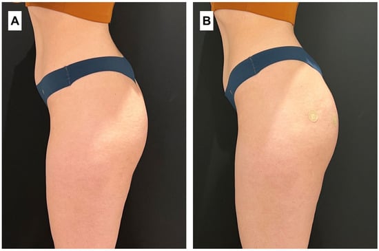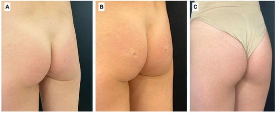 Currently, there is no consensus correlating the amount of injected HA with patient satisfaction and safety. Mortada et al. found an estimated mean of 250.75 mL of HA injected per subject in a single session, with a range of 20 mL to 400 mL. This review also demonstrated a product durability of at least 24 months, with minimal displacement and high patient satisfaction [28]. In our cases, a total amount of 30 mL of HA per patient was injected in a single session, effectively enhancing gluteal volume and projection with this relatively small quantity of dermal filler.