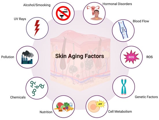 Skin aging is a natural phenomenon that develops in different cells, tissues, or organs at separate times and stages. Human skin ages due to the accumulation of several factors, considered either intrinsic or extrinsic [1]. Intrinsic factors include hormonal disorders, reactive oxygen species (ROS), moisture loss, metabolic events, cell metabolisms, genetic factors, and many others, contributing to skin aging and the deterioration of its natural balance [2]. The primary extrinsic factors include pollution, chemicals, and especially the damaging effect of sunlight (UV) on the external appearance of the skin (Figure 1). Additively, UV light is the most common factor to join with other factors, leading to skin damaging and aging [3]. UV light acts as a mutagenic agent, leading to skin cancer in severe cases. Furthermore, UV light causes oxidative damage to the DNA, lipid tissues, and proteins in the body, forcing these molecules into cell apoptosis [4]. Conditions such as laxity, wrinkles, black spot formation (spotting), thinning, and loss of elasticity and brightness in the skin are visible signs of aged skin. These symptoms arise as a consequence of the skin repair mechanism progressing slower than the degradation mechanism over time [5]. Simultaneously, the degradation of the collagen molecule, which provides brightness, flexibility, and supports the skin’s connective tissue, increases the skin’s sensitivity to aging [6].