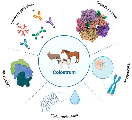 Colostrum, also known as initial milk, is the first form of foremilk secreted by Mammalia (bovine, sheep, mare, etc.) in the early postnatal period [24]. It contains the same nutrients as mature milk but with remarkably higher levels of fat, protein, peptide, vitamin, mineral, hormone, growth factor [25], cytokine, and immunoglobulin, and lower lactose content [26,27,28] (Table 1). According to the studies referenced in Table 1, it is shown that colostrum of different species contains different concentrations and ratios of components. Colostrum finds applications in supporting and strengthening the immune system [29] and promoting intestinal health in humans [30,31]. Additionally, it serves as a food supplement in sports nutrition, being a rich source of carbohydrates and fat (macronutrients), vitamins and minerals (micronutrients), peptides with antimicrobial activity, subcomponents, and growth factors [32,33]. Research on these components has shown that colostrum facilitates the reproduction of skin cells, stimulates differentiation, supports the repair of skin wounds, and reduces allergic inflammation on the skin [34].