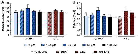 The metabolic activity (A) and relative DNA concentration (B) of non-stimulated (W/o LPS) and LPS-stimulated hMDMs cultured or not in the presence of different concentrations (5, 12.5, 25, 50, and 100 µM) of 1,2-DHX and clinically used anti-inflammatory compounds (dexamethasone (DEX) and celecoxib (CEL) at 10 μM). The dotted line represents the metabolic activity and the DNA concentration of the positive control (LPS-stimulated hMDMs without treatment (CTL LPS)). The results of three independent assays (n = 3) are expressed as means ± SDs (standard deviations).