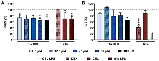 The PGE2 (A) and IL-6 (B) percentages of non-stimulated (W/o LPS) and LPS-stimulated hMDMs cultured in the presence or in the absence of different concentrations of 1,2-DHX and clinically used anti-inflammatory drugs (dexamethasone (DEX) and celecoxib (CEL) at 10 μM). The dashed line indicates the highest amount of generated pro-inflammatory mediators in the positive control (LPS-stimulated hMDMs without treatment (CTL LPS)). The results of three independent assays (n = 3) are expressed as means ± SDs, and statistically significant differences are indicated by * p < 0.05, ** p < 0.01, and **** p < 0.0001 in comparison with the respective positive control.