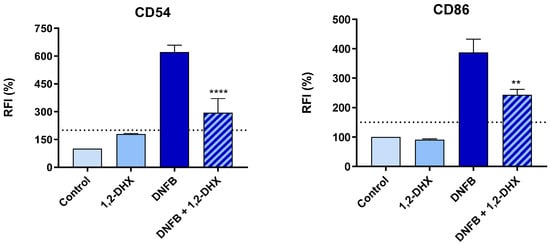 The human monocyte THP-1 cell line was also employed as a dendritic cell (DC) surrogate for the skin sensitizing hazard, following OECD guidelines. By adjusting OECD test Guideline No. 442E [16], the THP-1 cell concentration was set to 0.5 × 106 cells/mL, and they were incubated overnight at 37 °C in a 5% CO2 saturated atmosphere. On the following day, cells were plated in a 12-well plate (1.5 mL/well), and 1.2-DHX was applied at the final concentration of 100 µM. After pre-incubation (1 h at 37 °C) with the active compound, a solution of DNFB, prepared in DMSO, was added (final concentration of 8 µM), and cells were additionally incubated for another 24 h under the previously mentioned conditions. Afterwards, cells were transferred to eppendorfs and centrifuged at 300× g for 5 min at 4 °C. The supernatant was rejected, and the cell pellet was washed with PBS/1% FBS (2 × 1 mL) and centrifuged at 300× g for 5 min at 4 °C. Then, cells were further resuspended in 1 mL of PBS/1% FBS, and 200 µL was collected for two 1.5 mL eppendorfs equally divided for unstained (UNST) and stained (CD5486) conditions. Each stained condition contained 3 µL of each antibody, anti-CD86 and anti-CD54, and was further incubated in the dark for 30 min at 4 °C. Afterward, cells were washed with PBS/1% FBS and centrifuged at 300× g for 5 min at 4 °C. Then, the supernatant was discarded, and 100 µL of PBS/1% FBS solution was added to the cell pellet and gently homogenized for subsequent analysis through the flow cytometry technique (BD Accuri™ C6 cytometer (San Jose, CA, USA)). Flow cytometry was used to examine the levels of the cellular membrane markers CD86 and CD54 by using acquisition channels FL1 and FL4, respectively. For control cells and chemical-treated cells, the relative fluorescence intensity (RFI) of the membrane markers CD86 and CD54 was calculated by utilizing the geometric mean fluorescence intensity (MFI) and the following equation: