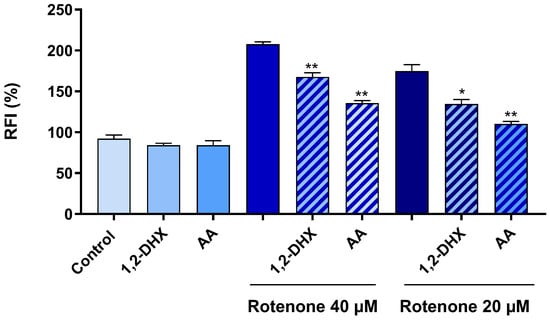 The pro-oxidant potential (compared with control; 100%) and mitochondrial antioxidant activity of 1,2-DHX (100 µM) under rotenone-induced oxidative stress in RAW264.7 cells (compared with rotenone). The antioxidant control ascorbic acid (AA) was also tested. The relative fluorescence intensity (RFI) of the fluorescent probe was measured. The results of eight independent assays (n = 8) are expressed as means ± SEMs, and statistically significant differences observed are indicated by * p < 0.05 and ** p < 0.01 compared with the positive control (Rot) at the tested concentrations.