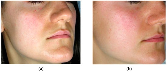 (a) A young woman affected by rosacea at baseline; (b) Outstanding results observed after two PDL sessions.