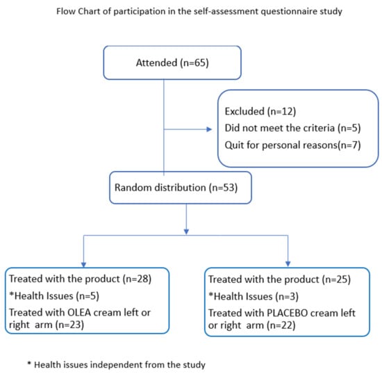 Finally, forty-five female volunteers aged between 30 and 60 (mean age: 45 ± 5 years), belonging to phototypes II and III according to Fitzpatrick classification, were included in the self-assessment questionnaire study after signing the appropriate informed consent form. This study was conducted during the years 2022–2023. The area treated with OLEA VITAETM 02 cream or the placebo was the left or right arm, which was randomly assigned (Figure 1). This study was approved by the Research Ethics Committee of the University of West Attica, Greece (Decision Number 37942/11-05-2021).