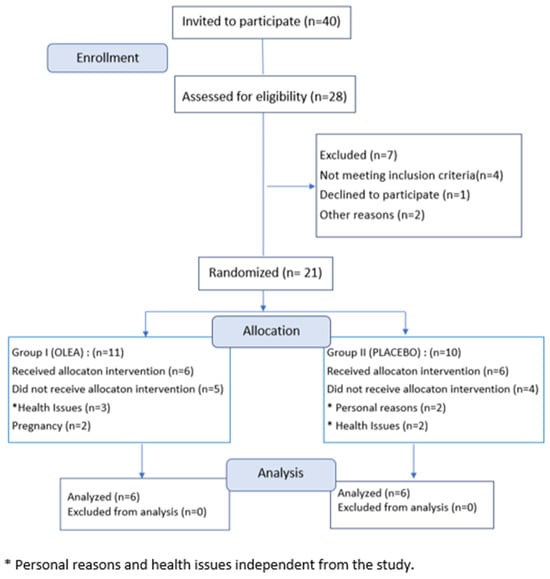 Data are expressed as the mean ± standard deviation (SD). The Shapiro–Wilk test examined the normality of the variables’ distribution. We used the two-way mixed ANOVA model using ‘intervention’ (between-group) and ‘time’ (within-group) as comparison factors for the analysis of variables using Bonferroni correction for all pairwise comparisons. Sensitivity analysis of variables concerning the baseline balance between the groups was performed using the following two methods: (a) The mean percentage change from baseline after 14 days, where comparison of percentage changes between the groups was compared, was analyzed using the independent samples t-test, and Mann–Whitney tests were used in the case of a violation of normality. (b) The absolute change from baseline after 14 days was analyzed using the analysis of covariance model (ANCOVA) considering the absolute change from baseline to 14 days as the dependent variable, the group (placebo vs. OLEA VITAE™ 02) as a factor, and the baseline value of the variables as a covariate. All tests were two-sided, and statistical significance was set at p < 0.05. All analyses were carried out using the statistical package SPSS vr. 21.00 (IBM Corporation, Somers, NY, USA).