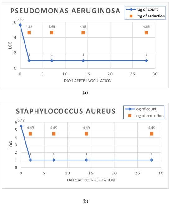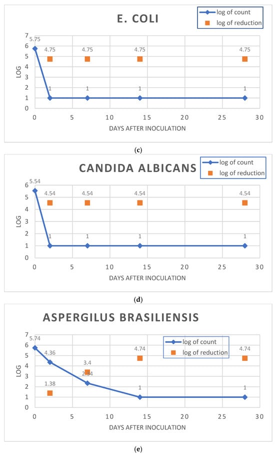 Test for the efficacy of antimicrobial evaluation according to Eur. Pharm. for the OLEA VITAE™ 02 cream. Subfigures (a–e): log reduction charts for (a). Staphylococcus aureus, (b). Escherichia coli, (c). Pseudomonas aeruginosa, (d). Candida albicans, (e). Aspergillus brasiliensis.