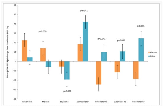 Mean percentage change in the measured values (D0–D14) for the tested creams OLEA VITAE™ 02 (referred to as OLEA in Figure 4) and the placebo.
