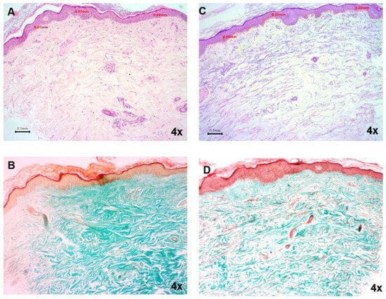 Representative hematoxylin/eosin-stained skin tissue punch biopsies from the placebo and OLEA VITAE™ 02 cream groups, respectively (A,C). Representative Masson trichrome-stained skin tissue punch biopsies from untreated and treated volunteers (B,D). Images (A,B) represent the same case (case, coded VG10.1) as (C,D) (case, coded VG7.2). All magnifications are 4×. Scale bars of 0.1 mm are shown. Epidermis depth was calculated in multiple random positions and is shown in (A,C).