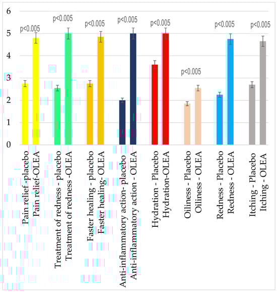 The self-assessment questionnaire completed by volunteers at the end of this study reflected that the OLEA VITAE™ 02 cream showed better scores in comparison with the placebo group (Figure 6) regarding the tested variables: pain relief (p < 0.005), treatment of redness (p < 0.005), faster healing (p < 0.005), anti-inflammatory action (p < 0.005), hydration (p < 0.005), oiliness (p < 0.005), redness (p < 0.005 ), and itching (p < 0.005). The active cream showed anti-irritant and anti-inflammatory effects, which is consistent with the statistically significant measurements of the erythema index. Improved hydration was noticed by the volunteers using the OLEA VITAE™ 02 cream, which is also in correlation with the biophysical measurement. Additionally, volunteers were satisfied with the texture of the cream.